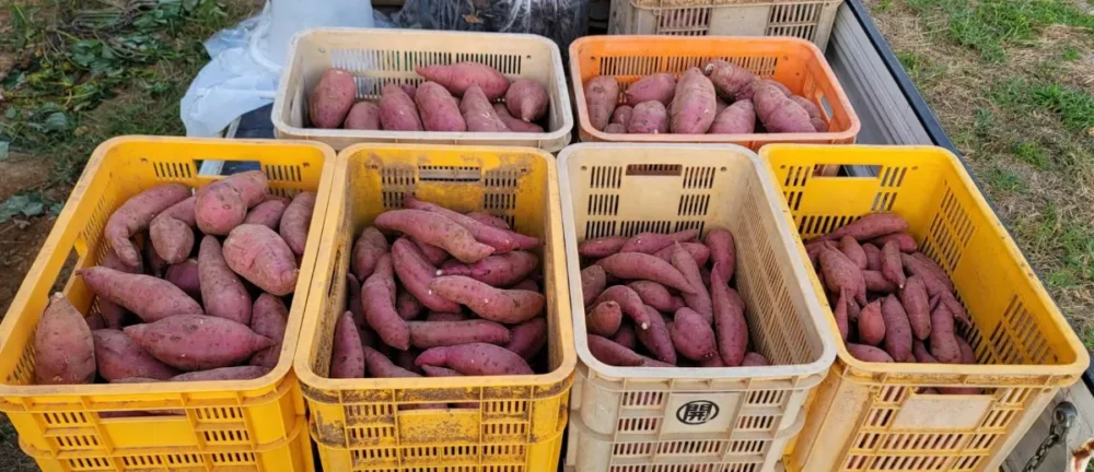 このまま天日干しをして一旦水分を飛ばします。収穫後のさつまいもは保存する前に天日干しをして水分を飛ばさないと水分を多く含んでいるため腐りやすいとの事。しばらく日光浴させま~す🌞