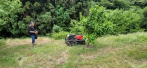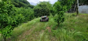 コチラはラジコン草刈り機❕ KIORITZのRCM600というモデル❕移動時はバッテリーだけでも動かす事が出来るハイブリットシリーズです。バッテリーでの移動時は音も静かで動きも早い。軽トラックにも載せる事が出来るコンパクトなサイズで弊社のような農園が複数にある場合でも困りません。白岩地区での共同の物で普段の管理は弊社が代表して行っています。