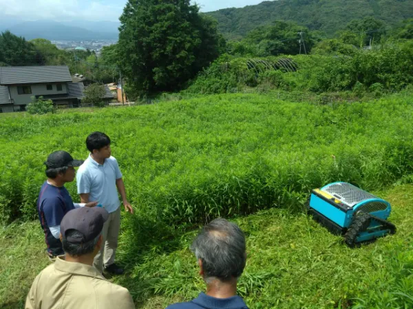 実演会には弊社農業事業担当 陣内常務・小川リーダーの2名と、地元で長年璃の香栽培に携わり弊社の農業事業開始より1から教えて頂いている下村様、白石町役場のご担当者様5名の方にお集まりいただき実演開催となりました。今回お持ち頂いたラジ刈る君は刈る時の高さ調整が搭載された機種でした。弊社の農園は場所柄、石垣のある段々畑の傾斜地で地面に結構大きめの石が埋まっている事も多く、弊社のような使用環境の所では重宝する便利な機能です。
