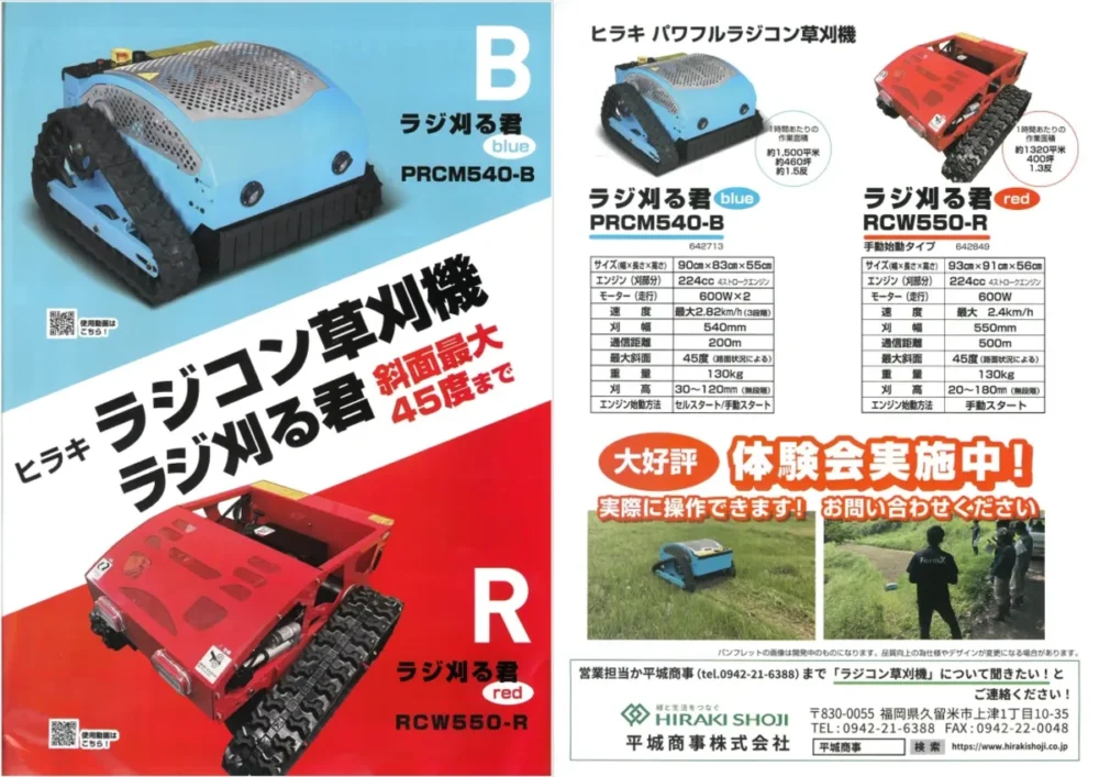 ラジコン草刈機に興味のある方は上記画像に平城商事株式会社様の連絡先が記載されているのでお気軽にお問い合わせください。親切丁寧に分かりやすく説明して頂けます!